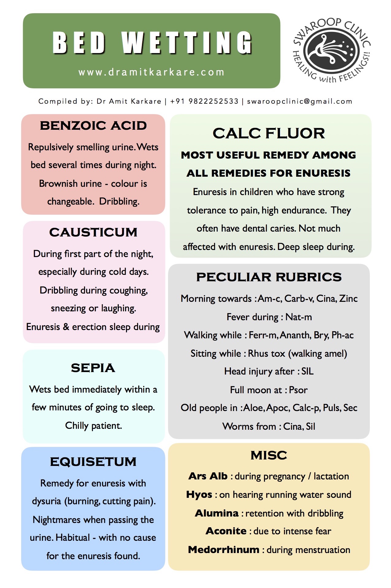 Here are the most commonly indicated homeopathic remedies for primary & secondary enuresis / bed-wetting